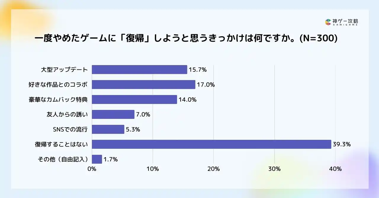 | ゲームへの復帰のきっかけについては「好きな作品とのコラボ(17.0%)」「大型アップデート(15.7%)」が上位でした。 | |||