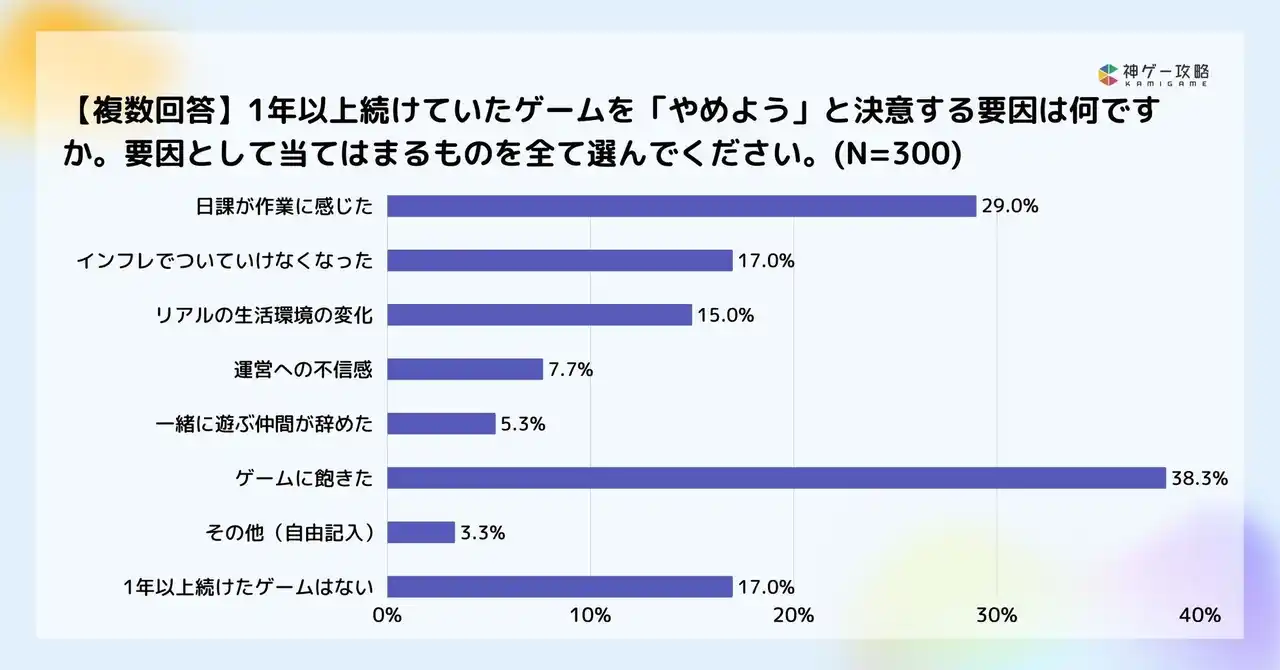| 続いて「日課が作業に感じた(29.0%)」「インフレでついていけなくなった(17.0%)」が挙がり、マンネリ化や難易度バランスが影響していることがうかがえます。 | |||
