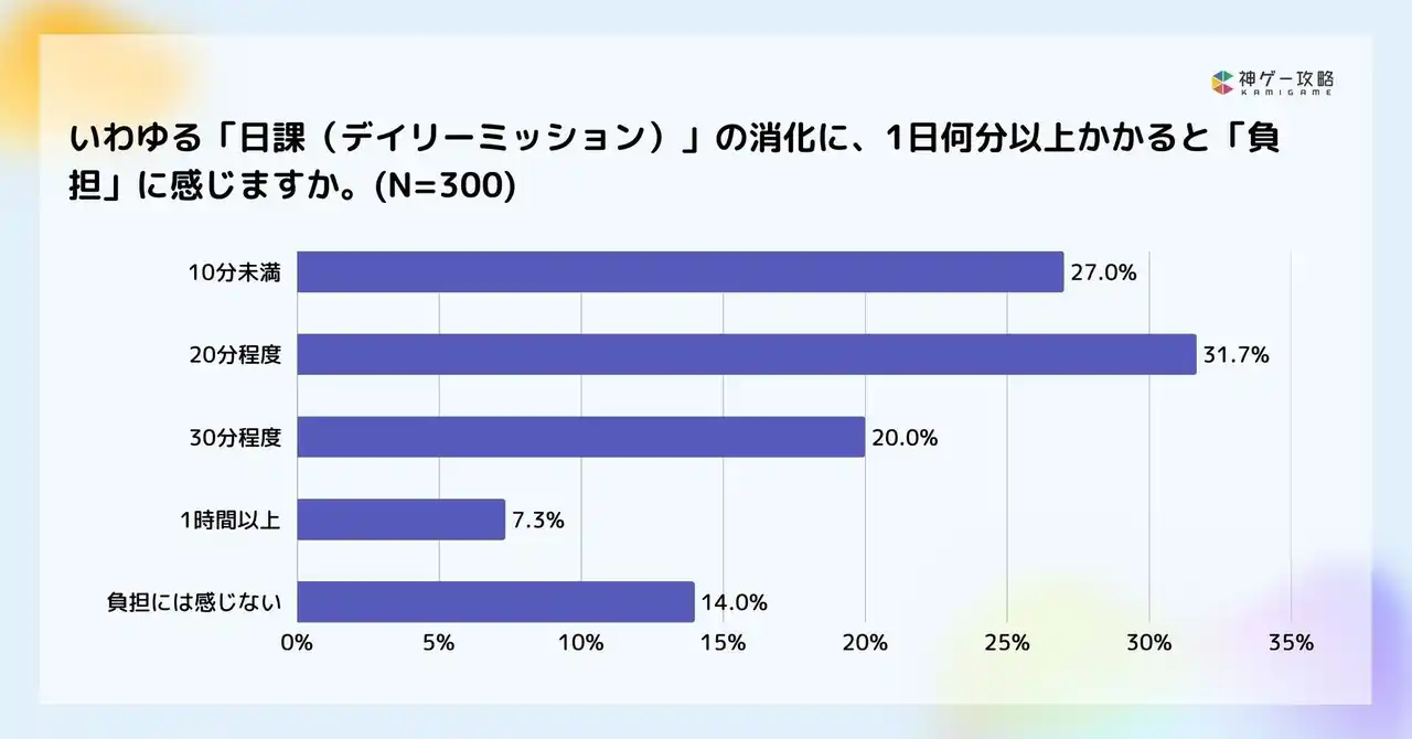 | デイリーミッションなど、日課の消化については「20分程度で負担(31.7%)」が最多でした。 「10分未満(27.0%)」も多く、日々のプレイ時間が継続意向に影響する可能性が示されました。 | |||