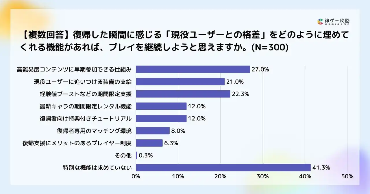 | 復帰後に求める機能では「高難易度コンテンツに一気に到達できる権利(27.0%)」が最多でした。 | |||