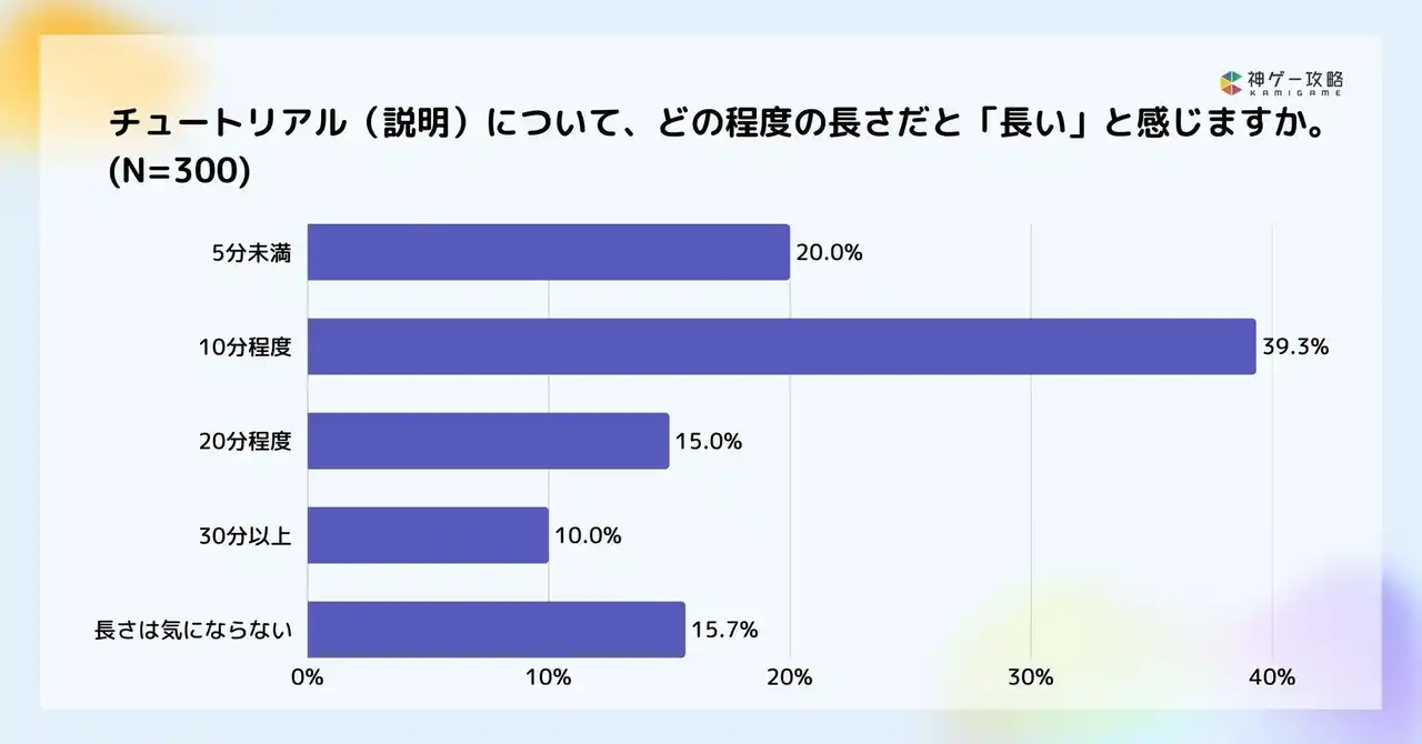| チュートリアルが長いと感じる程度については「10分程度」で長いと感じる人が39.3%で最多となりました。 「5分未満(20.0%)」と合わせると、約6割が10分以内で長いと感じていることになります。 | |||