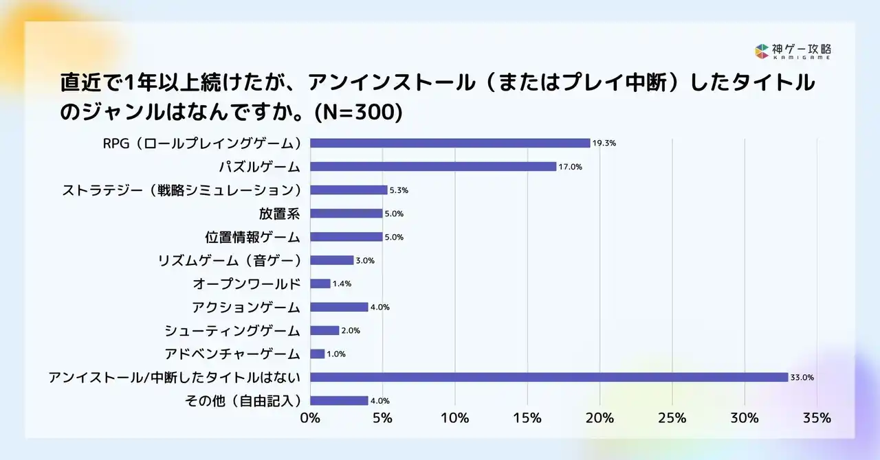 | 1年以上続けた後に離脱したゲームのジャンルでは、「RPG(19.3%)」が最多、次に「パズルゲーム(17.0%)」が続きました。 | |||