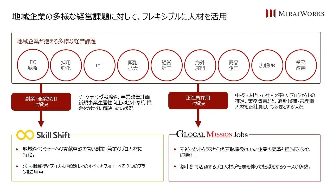 当社は、副業マッチングサービス『Skill Shift』(https://www.skill-shift.com/)と、地方転職マッチングプラットフォーム『Glocal Mission Jobs(GMJ)』(https://glocalmissionjobs.jp/)を運営し、地方中小企業が都市部の優秀な人材を経営幹部や後継者として、正社員採用、または副業採用をするための支援を行っています。 |