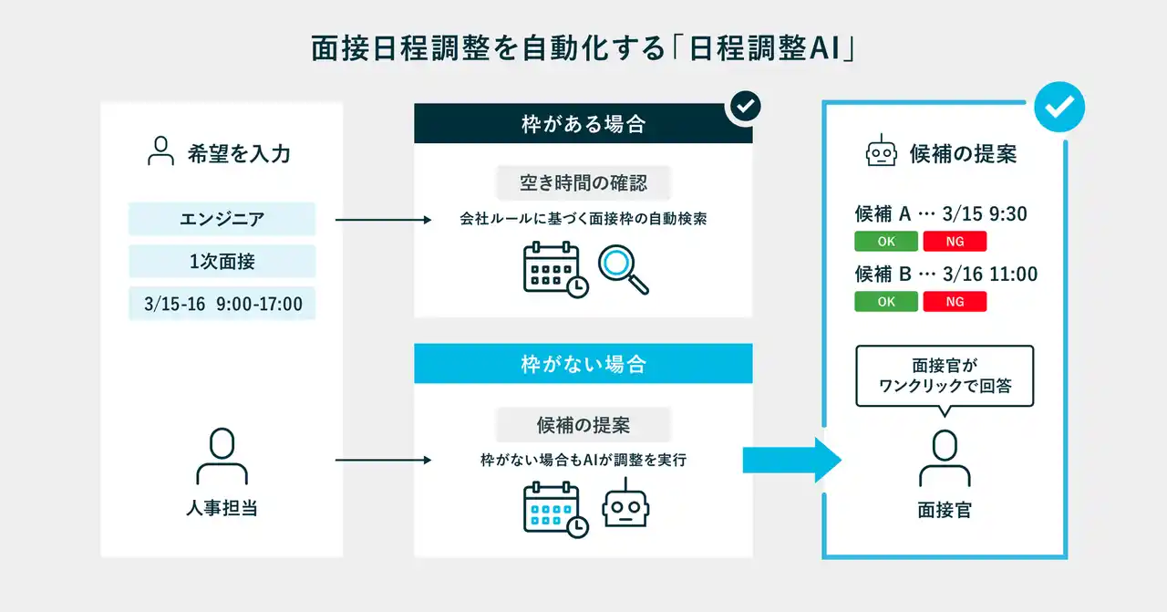 株式会社PKSHA Technology(読み:パークシャテクノロジー、本社:東京都文京区、代表取締役:上野山 勝也、以下PKSHA)は、株式会社トライアンフ(本社:本社:東京都渋谷区、代表取締役 松下 直樹、以下トライアンフ)とAIが自律的に面接日程を調整する新ソリューション「日程調整AI」を共同開発しβ版として提供開始したことをお知らせします。本ソリューションは、PKSHAが展開する人事向け総合ソリューション「PKSHA AI Suite for HR」のラインナップに新たに加わります。