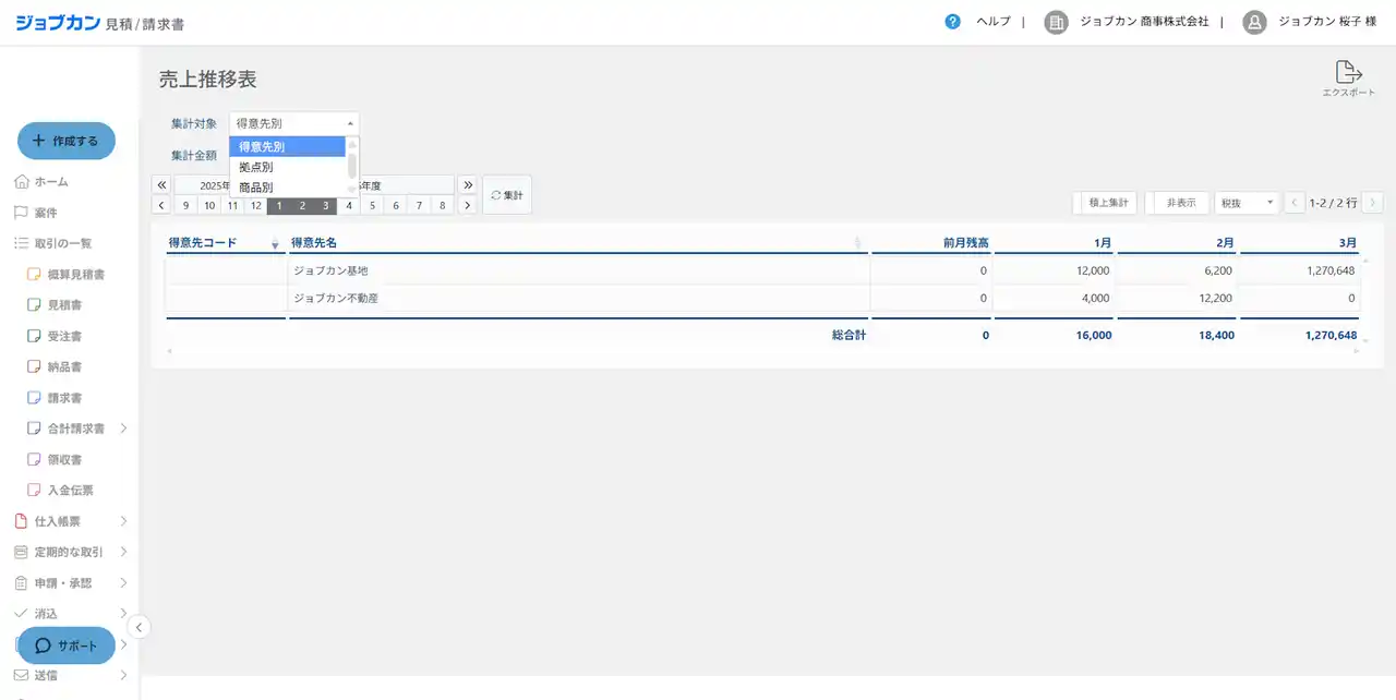 売上や仕入を月別に集計できます。さらに、得意先・商品などの条件で集計対象を絞り込めるため、売上の傾向をより細かく分析できます。 |