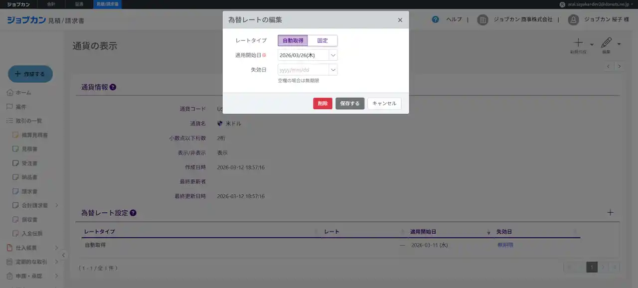 一部の外貨は為替レートも自動取得でき、直接「帳票作成日の為替レート」の反映が可能です。 |