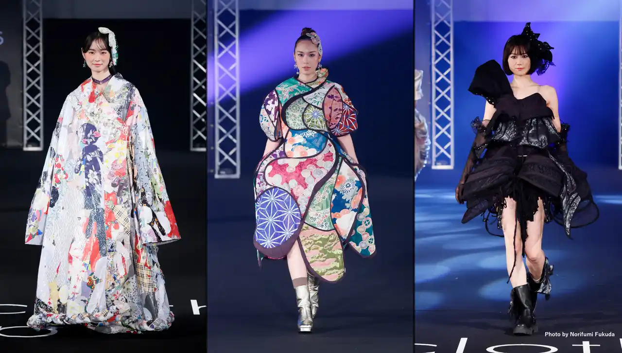 (左)BOOKOFF賞:長谷川 悠人 様(国際トータルファッション専門学校)、(中)審査員特別賞:関 のの子 様(香蘭ファッションデザイン専門学校)、(右)審査員特別賞:小田根 愛里 様(大阪文化服装学院) |