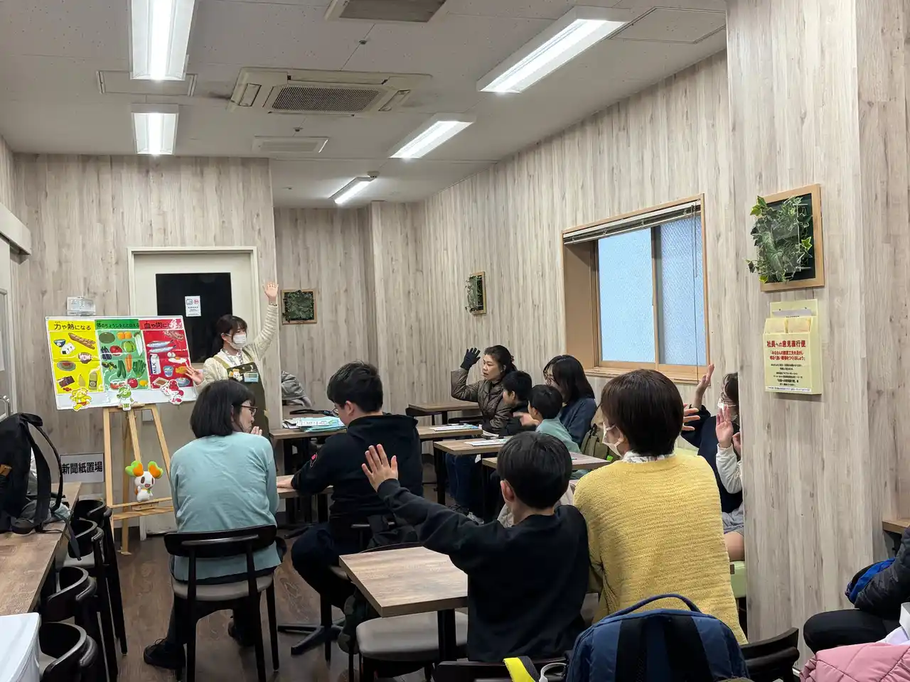 まず初めにライフから、食べることや食べ物の大切さを学ぶ学習として、バランスの良い食事や食品ロスについてお話しました。その後、クイズに答えながら料理教室で使用する野菜を探す「おつかいゲーム」を行いました。 |