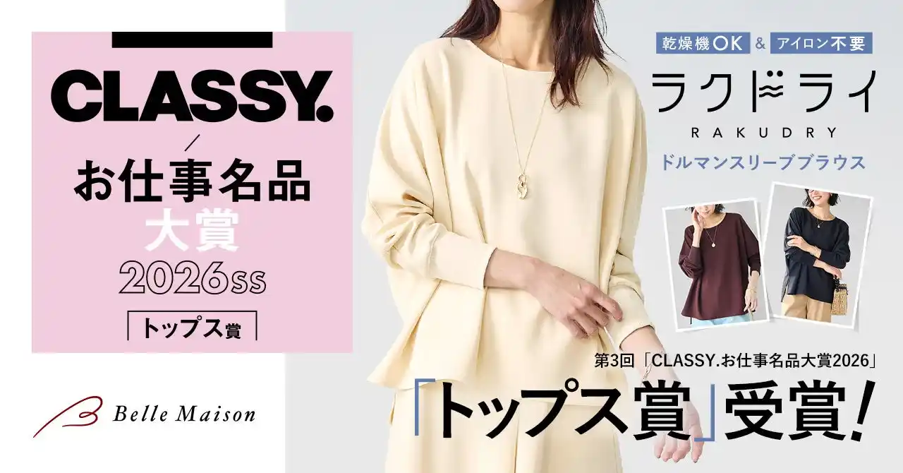 株式会社千趣会(本社:大阪市 代表取締役社長:鈴木聡 以下千趣会)の通販事業ベルメゾンが展開する、働く女性に向けた乾燥機対応のファッションブランド「ラクドライ」の「ドルマンスリーブブラウス」が、光文社発行のファッション誌『CLASSY.』が主催する第3回「CLASSY.お仕事名品大賞2026」トップス賞を受賞しました。 |