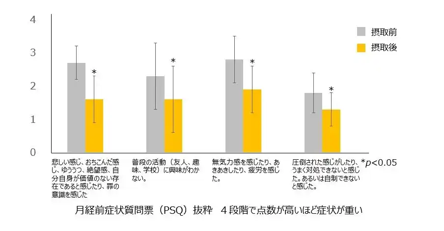 結果、「ゆううつ・落ち込んだ感じ」「興味がわかない」「無気力感」「圧倒された感じ」といった主に精神的な症状(心身の不調)の項目で大きくスコアが改善されていることが明らかとなりました。Pediococcus属の乳酸菌を直接飲用することでPMSによる心身の不調を改善するという臨床試験結果は世界でも希少な報告例となります*1。 |