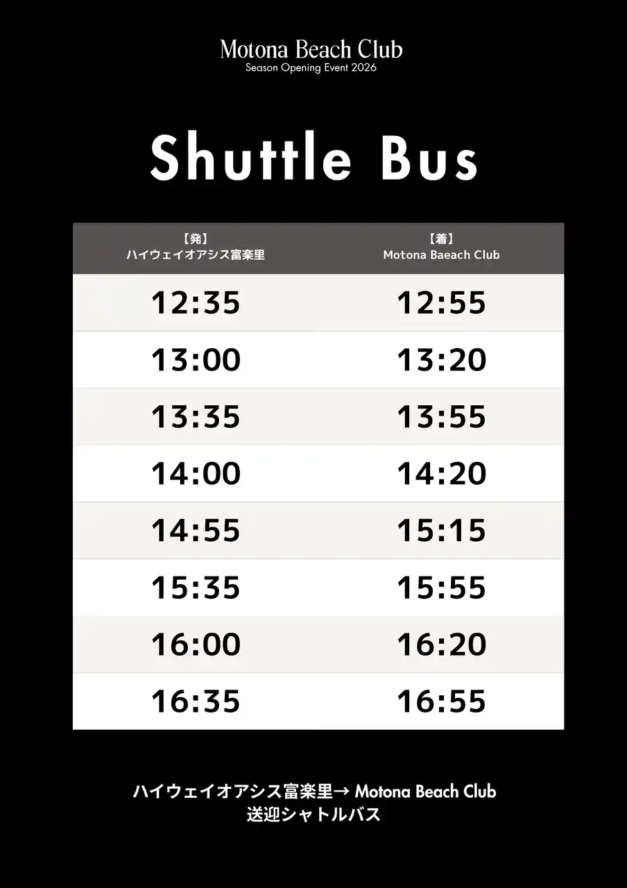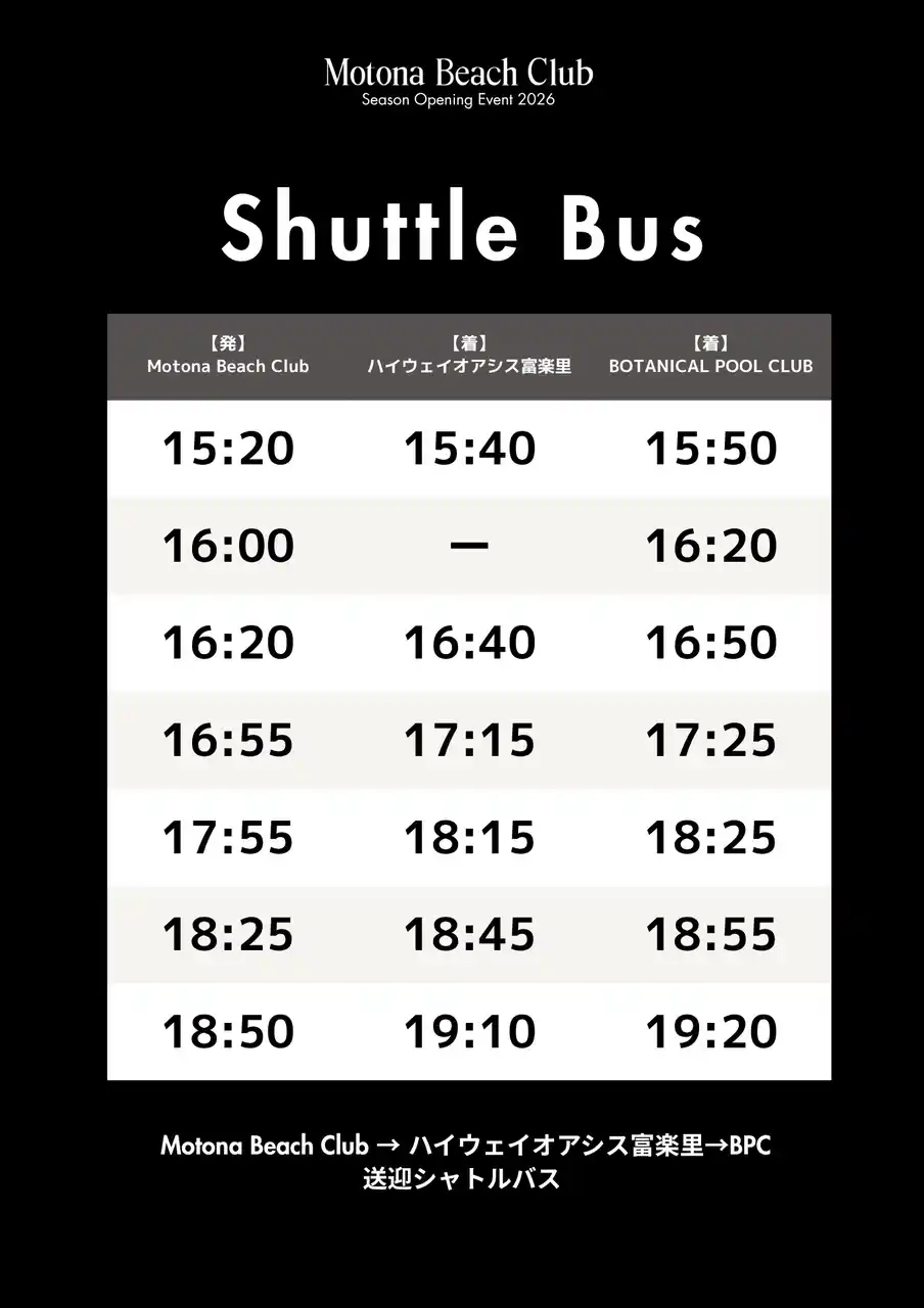 最寄りのバス停「ハイウェイオアシス富楽里」と「Motona Beach Club」、「Motona Beach Club」と「BPC」を繋ぐ送迎をご用意しています(無料)。 |
