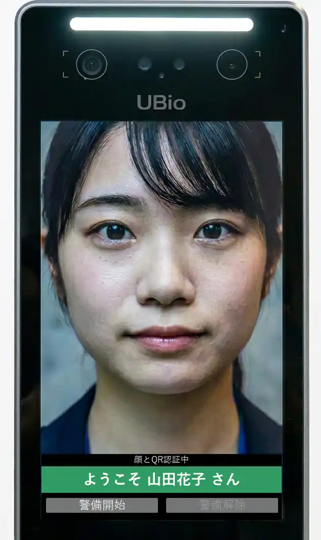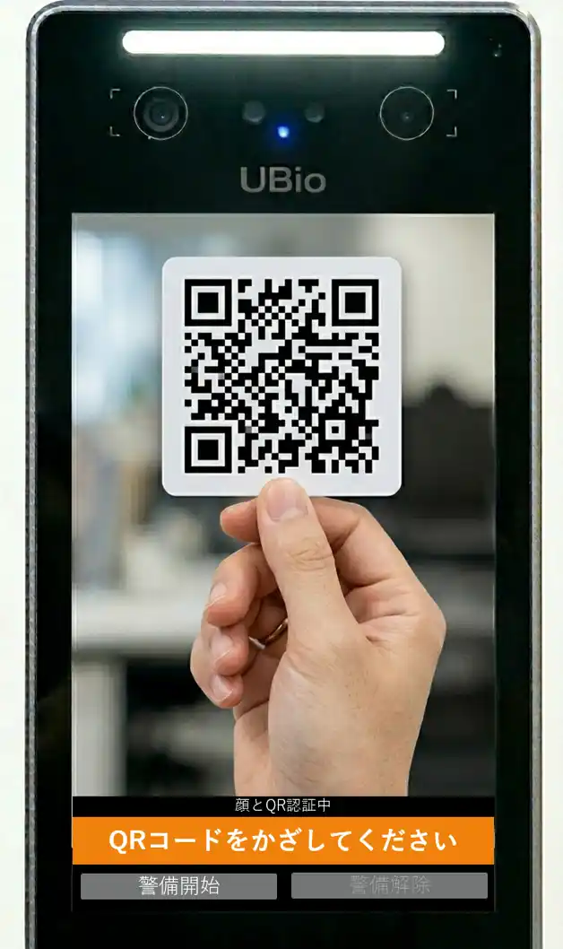 3.2要素認証 顔認証に加え、QRコードやICカードによる追加認証を行い、両方が成功した場合のみ警戒警備操作が可能。より高度なセキュリティ運用を実現 |