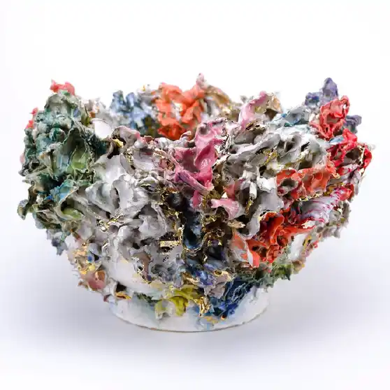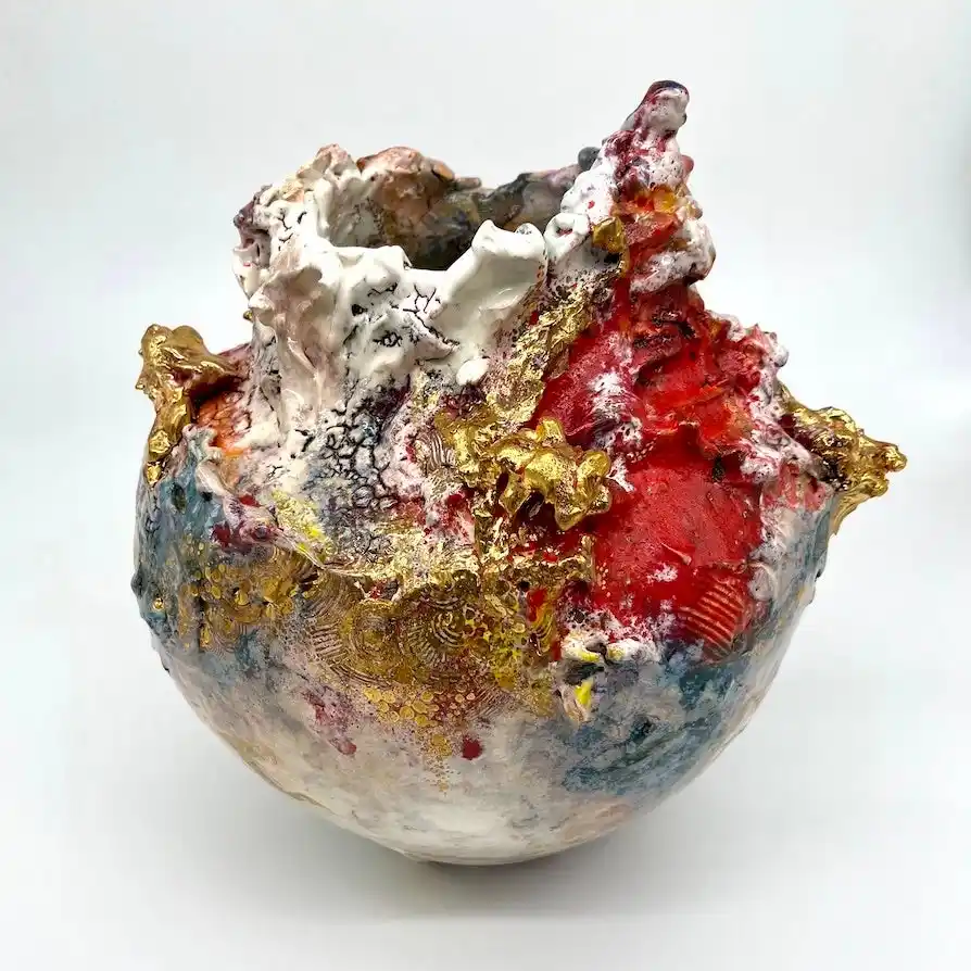 陶芸作家・中村真由美は、これまで、自己の内面に潜む不安や弱さを、「そのままの自分でいい。自分の花を咲かせればいい」という強いメッセージで包み込んだ「自在の花(※)」シリーズ。2020年コロナ禍以降の分断された世界における孤独感を、美しく溶け合う色彩で希望へと昇華させた「Universe」シリーズ。そして、「自在の花」と「Universe」の世界観を融合させた「宙に花」シリーズと、制作の節目ごとに、自身や時代・社会と向き合い、その想いを陶に託してきました。 |