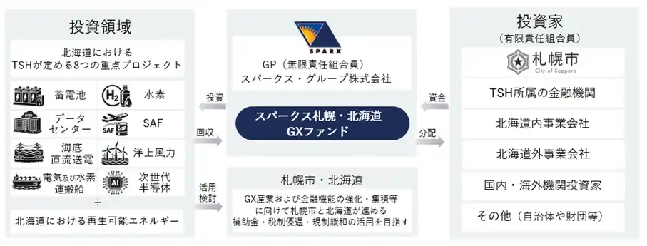 2023年にGX産業の創出と金融機能の強化を一体的に推進するため、産学官金の連携による枠組み「Team Sapporo-Hokkaido(※)」(以下「TSH」)が設立されました。さらに、2024年には札幌市および北海道が「GX金融・資産運用特区」(2026年2月に「GX/AI金融・資産運用特区へと改正」)に認定されるなど、GX分野における産業および金融機能の集積に向けた取り組みが進められています。本ファンドはこうした動きとも歩調を合わせながら、GX関連産業の発展および地域経済の活性化に資することを目指しています。 |