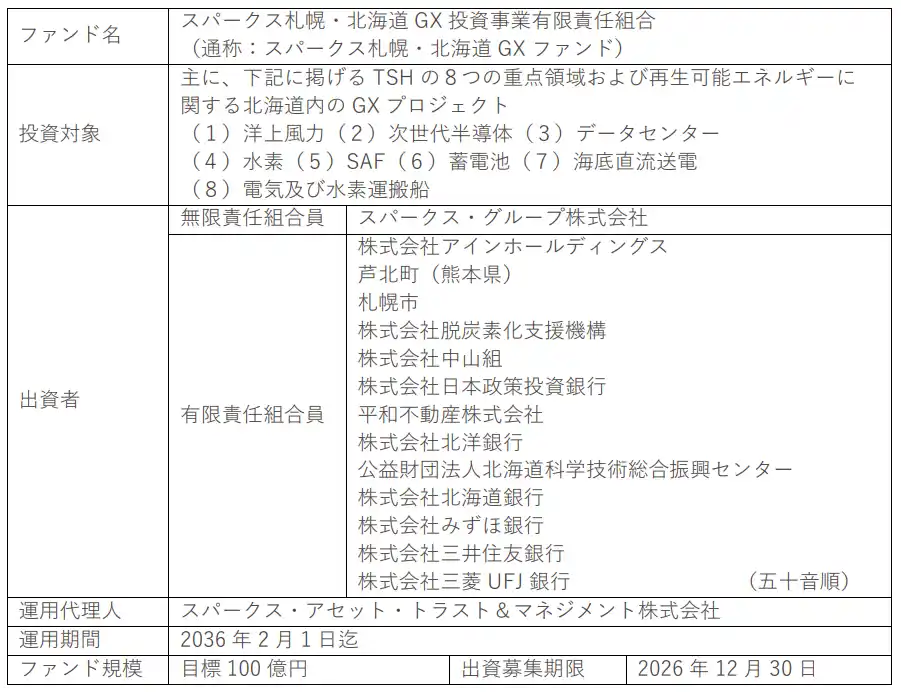 本ファンドは、北海道におけるグリーントランスフォーメーション(GX)関連プロジェクトへの投資を目的に設立された、国内初の地域特化型官民連携GXファンドです。北海道内の再生可能エネルギーに加え、洋上風力、次世代半導体、データセンター、水素、SAF、蓄電池、海底直流送電、電気及び水素運搬船などに投資検討を行う予定です。 |