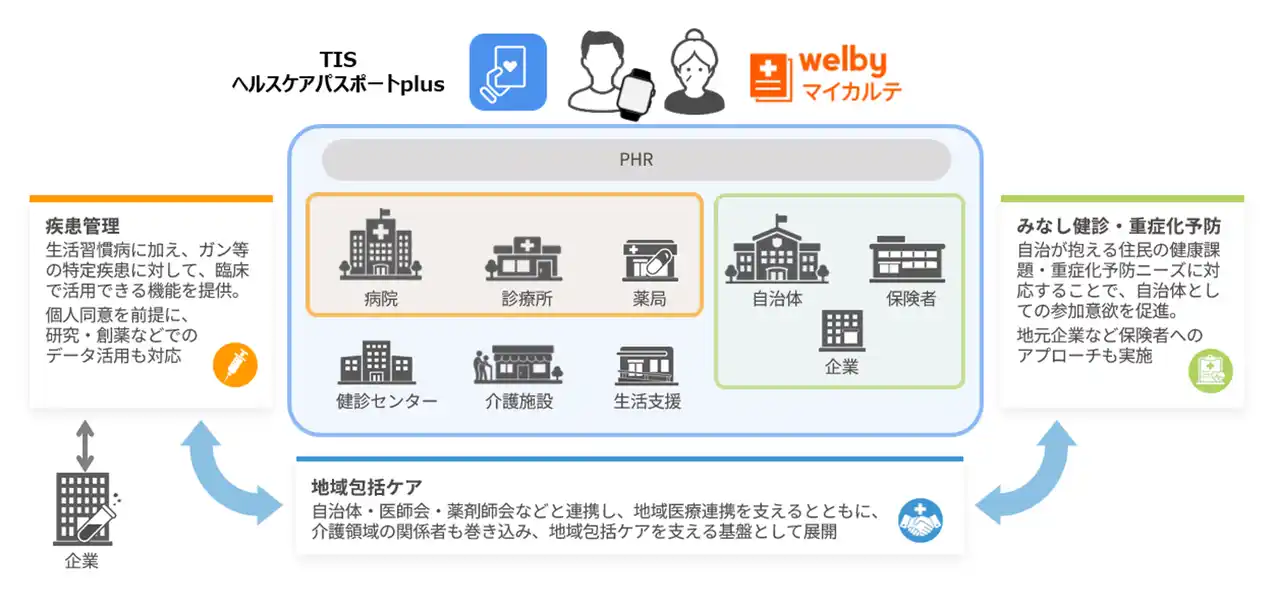 株式会社Welby(本社:東京都中央区、代表取締役:比木 武・山本 武、以下:Welby)とTISインテックグループのTIS株式会社(本社:東京都新宿区、代表取締役社長:岡本 安史、以下:TIS)とは、PHR※1を活用した地域包括ケア実現に向けた事業を共同で推進するため、2026年7月以降、「ヘルスケアパスポートplus」の提供を開始することを発表します。 |
