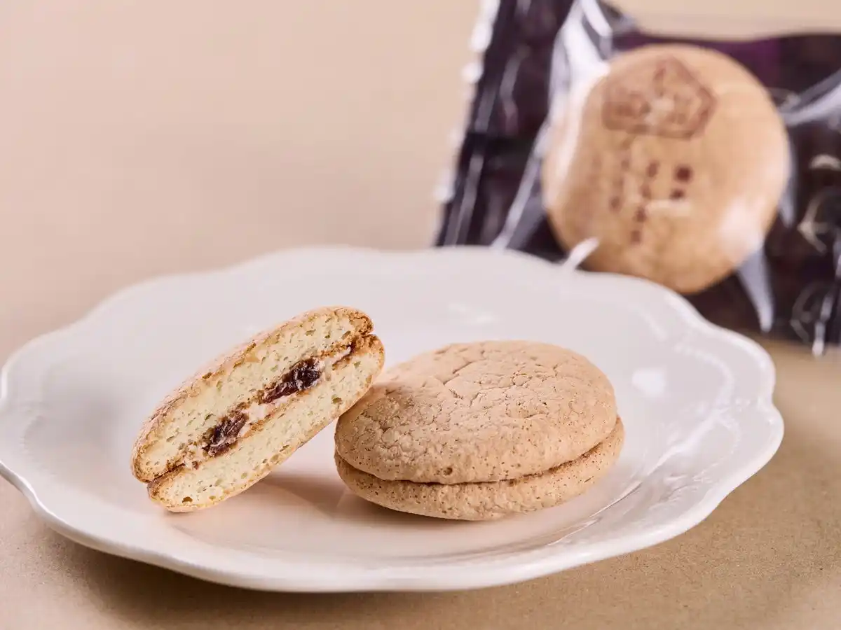 厳選されたアーモンドパウダーを贅沢に使用したふんわり、しっとりとしたブッセ生地に、クラッシュしたラムレーズンを贅沢に散りばめたラム酒香るクリームを優しくサンドしました。 |
