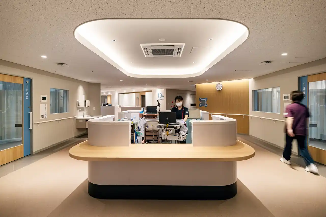 建設工事中はコロナ禍という未曾有の状況下にありましたが、設計者が現地に常駐し、病院スタッフの皆様との対話を重ねながら、運用に即した改善を現場で積み上げてきました。 特に、スタッフステーションから独立した看護拠点となるナースコーナーの導入や、ベッドから直接利用可能なトイレを備えた病室などは、モデルルームを通じて繰り返し検証を行い、現場との対話の中で作り上げた建築計画です。 これらの計画は、運用開始後、看護動線の効率化や患者さんのそばにいられる時間の増加につながり、身体抑制実施率や褥瘡推定発生率の低減、転倒・転落発生率の改善といった、具体的な成果としても表れています。 |