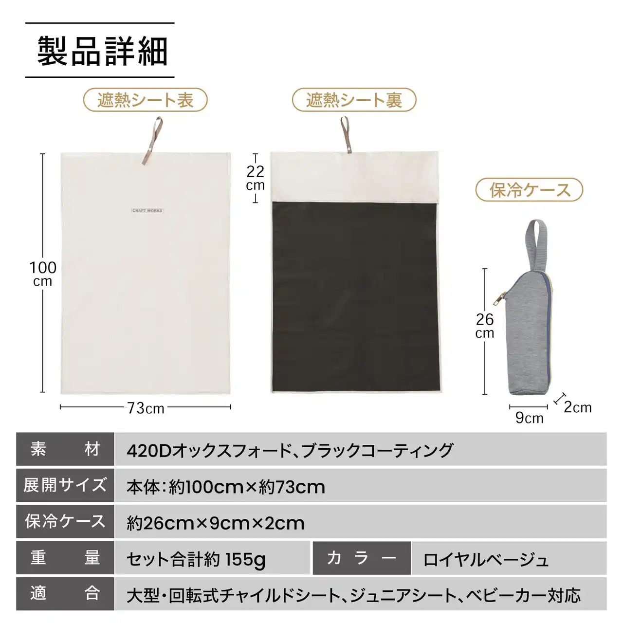 ・商品名:チャイルドシート遮熱カバー ・素材:420Dオックスフォード、ブラックコーティング ・展開サイズ:本体:約100cm×約73cm ・保冷ケース:約26cm×約9cm×2cm ・重量:セット合計約155g ・カラー:ロイヤルベージュ ・適合:大型・回転式チャイルドシート、ジュニアシート、ベビーカー対応 サイズ・重量は、計測方法によって若干異なる場合がございます。 |