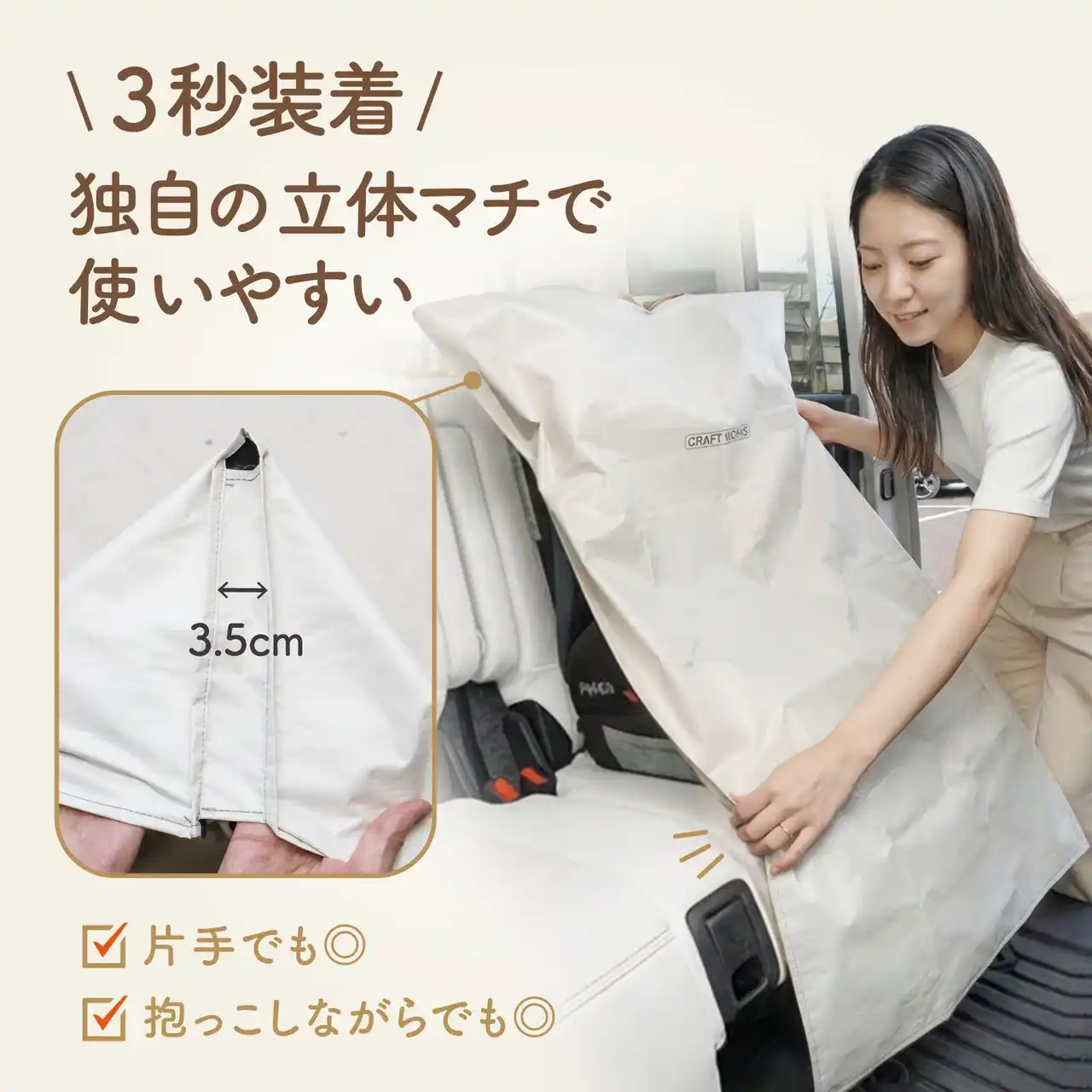 | マチなしカバーでは、大型のシートの形状に対応できず、被せづらさがあります。 本製品は、「独自マチ構造」を追加。主婦の皆さんもスッと装着しやすい設定にしました。毎日の乗せ降ろしをスムーズに。ストレス0の使いやすさを実現しました。 | |||||||||||||||