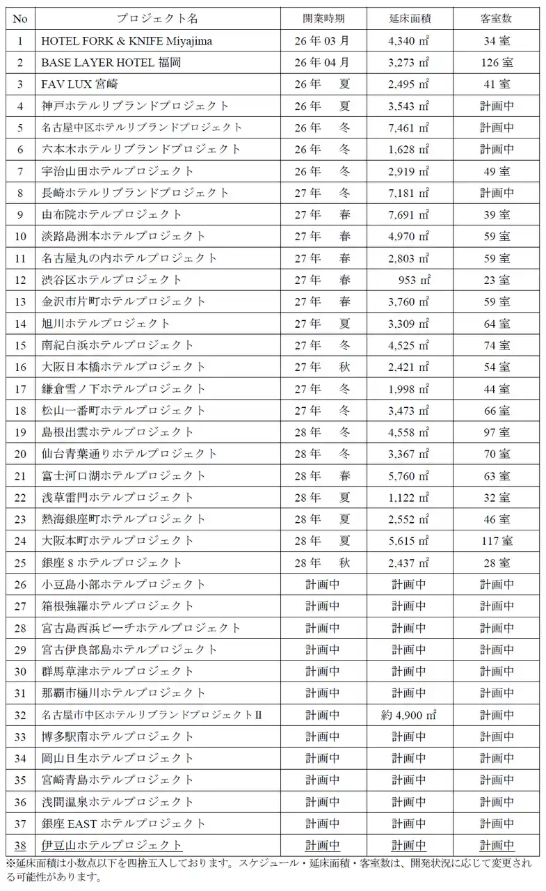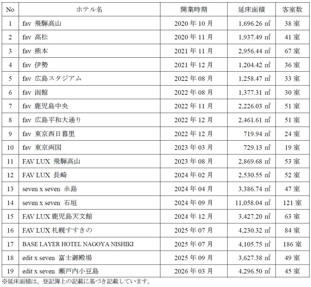 | 当社は、観光立国の実現や地域創生への貢献を目的にホテルの開発に取り組んでおり、多人数向けホテル『fav』『FAV LUX』『edit x seven』『seven x seven』、およびカルチャービジネスホテル『BASE LAYER HOTEL』をはじめとしたホテルブランドを全国で展開しております。このたび、当社グループの多人数向けホテルブランドの開発用地を新たに販売用不動産として取得いたしました。 | |||