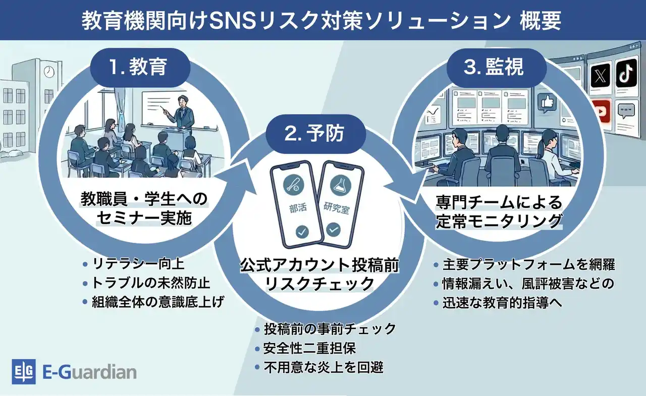 イー・ガーディアン株式会社(https://www.e-guardian.co.jp/ 東京都港区 代表取締役社長:高谷 康久 以下、「イー・ガーディアン」)は、SNSのリスクから学校運営を守り、実効性のある内部統制システム構築を支援する、教育機関向けSNSリスク対策ソリューションの提供を開始したことをお知らせいたします。 |
