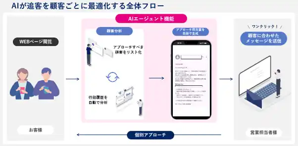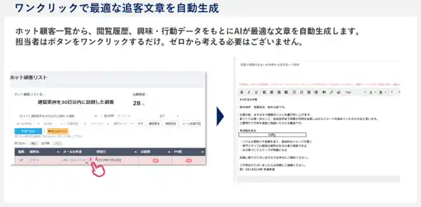 個別メール自動生成:AIが顧客ごとの行動履歴を自動解析し、個別最適化された追客文章をワンクリックで生成 |