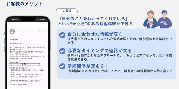 顧客の興味・行動データをAIがリアルタイムで自動学習し、完全個別・高精度な追客文章をワンクリックで生成し、「この担当者は、自分のことをわかってくれている」と顧客に感じてもらえる追客を、住宅・不動産営業の新しいスタンダードとして提供します。 |