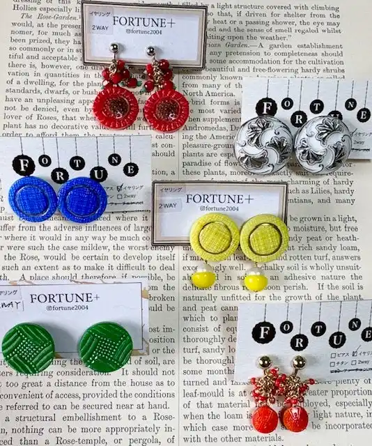 ヴィンテージパーツやガラスボタンを使用したアクセサリーは、季節の装いにさりげない彩りをプラスしてくれるアイテム。ヴィンテージならではの深みのある色合いを活かし、一つひとつ丁寧に仕立てられています。 |