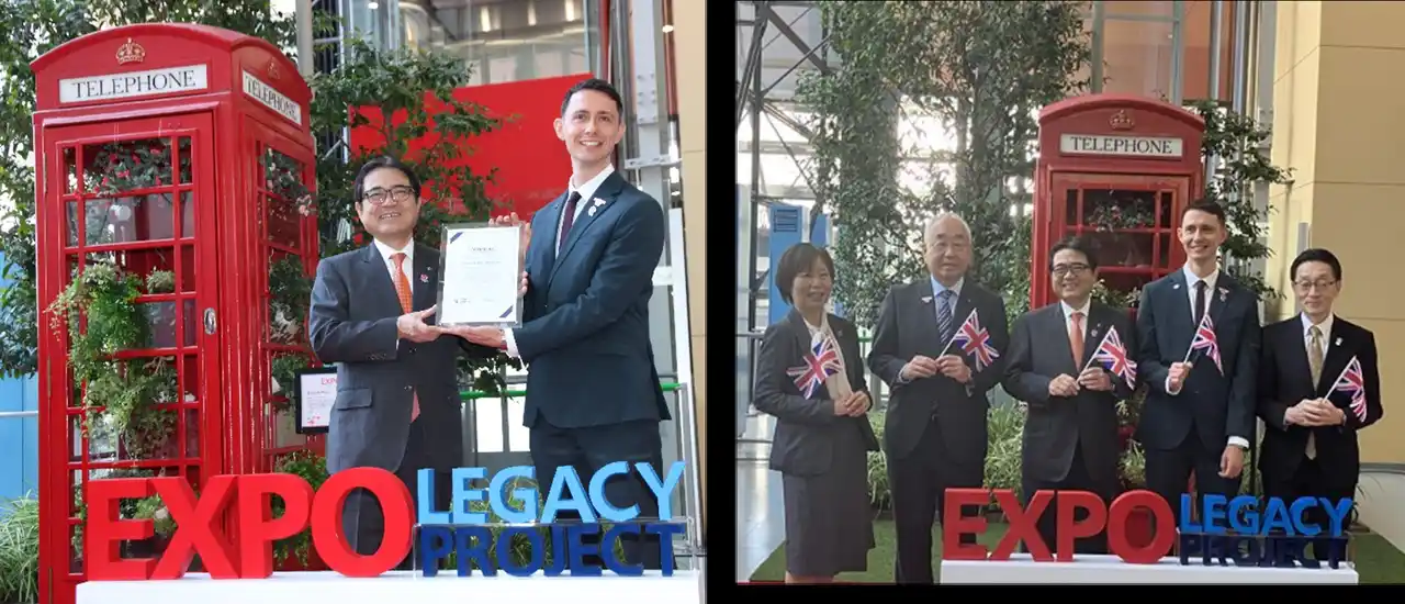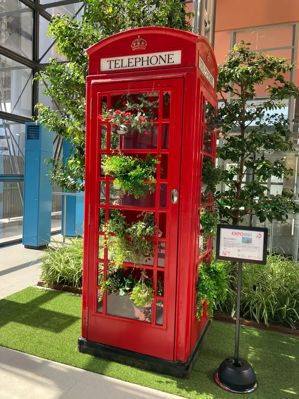 この赤い電話ボックスは、英国の街中で実際に使用されていたもので、万博会場ではアイビーなどの植物で装飾され、英国らしい美しいフォトスポットとして人気を集めました。 |
