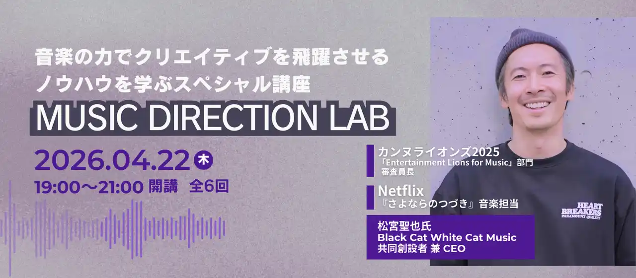 株式会社宣伝会議(本社:東京都港区/代表取締役社長:高橋 智哉)は、2026年4月22日(木)に、「音楽の力でクリエイティブを飛躍させるノウハウを学ぶスペシャル講座MUSIC DIRECTION」を開講します。 本講座は、音楽を使って自分の表現の幅を広げたいクリエイターやCM、映像作品に携わるディレクター・プランナーに向けて、音楽を軸にしたクリエイティブ思考を学ぶ開講します。 |