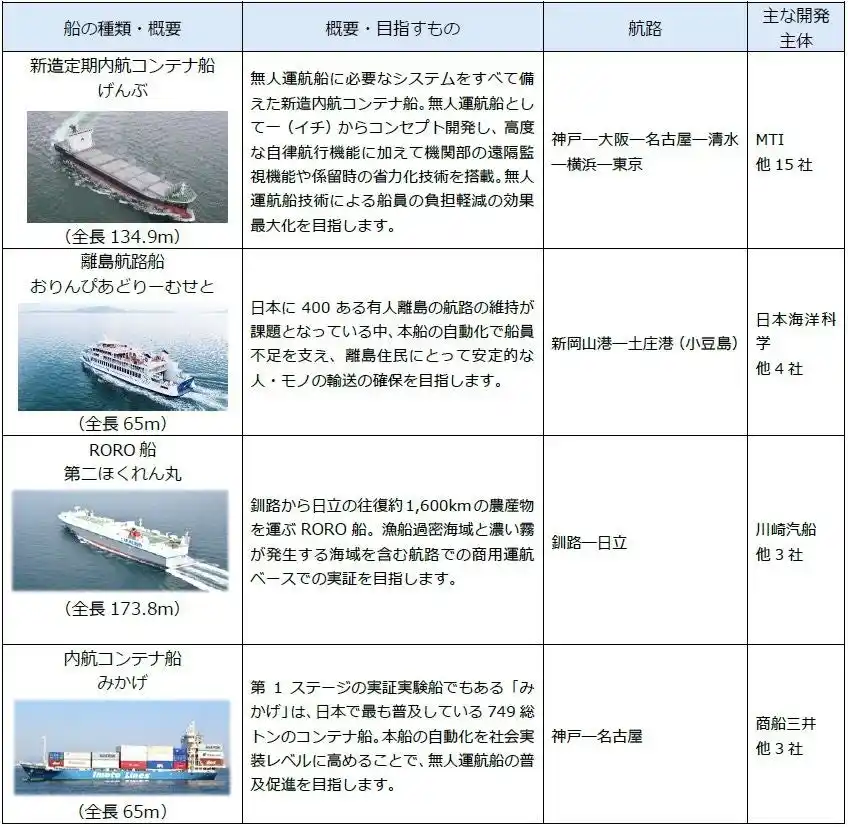 いずれの船舶も高度な自動運航システムに加え、第1ステージで課題となった船舶交通量の多い海域での航行や自動離着桟、複数船舶に対する陸上からの監視・支援等の技術を向上し、社会実装の実現を目指します。 |