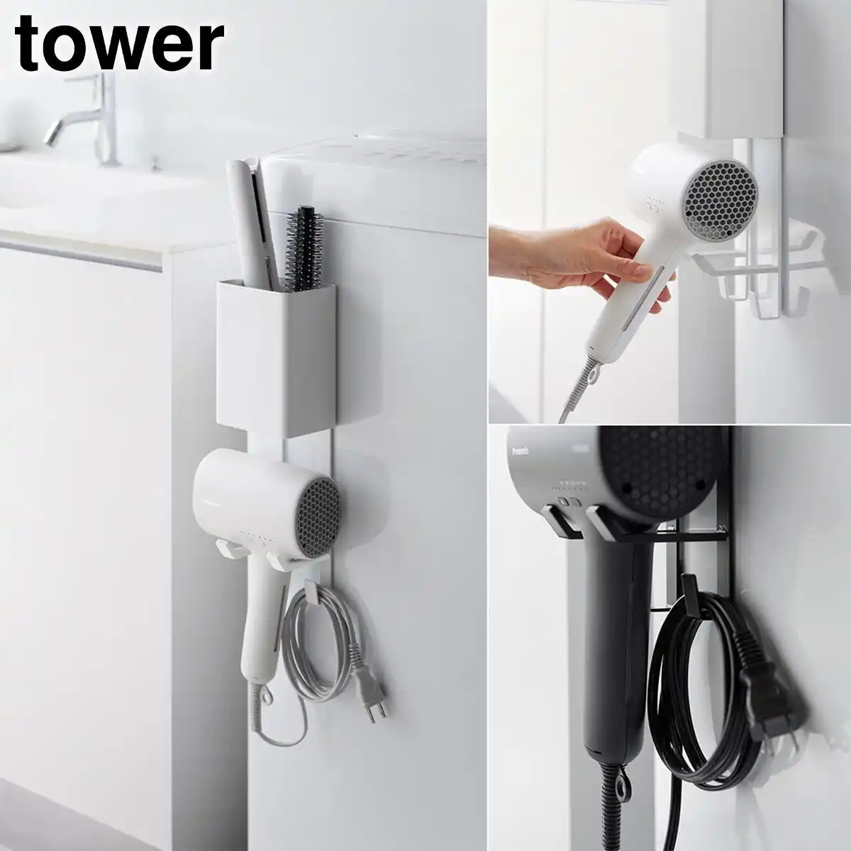 | ドライヤーやヘアーアイロンを、洗濯機横にすっきり一括収納できるマグネットホルダーです。 | |||