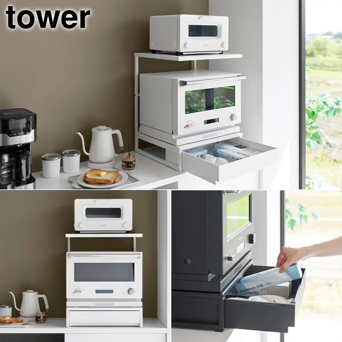 ■キッチン家電を省スペースにまとめて設置!2段式の引き出し付きキッチンラック
