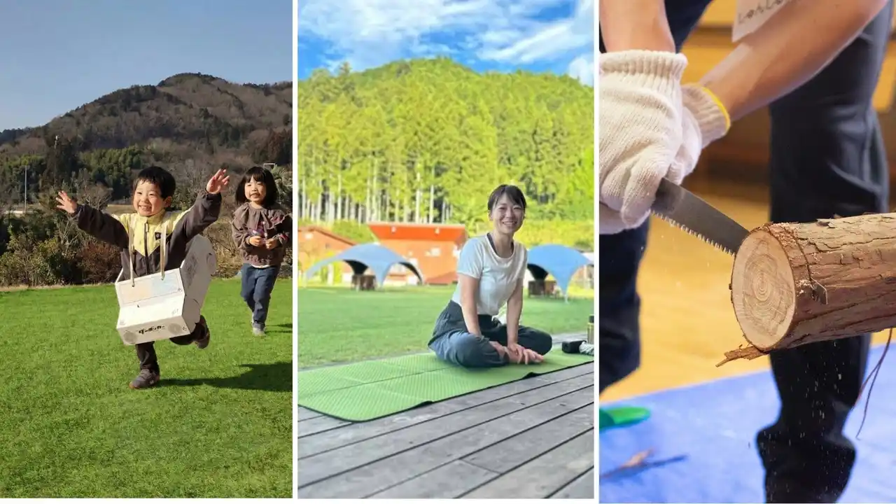 段ボールカー工作や親子ヨガ、西川材のコースター作りなど、多彩な体験プログラムを実施 |