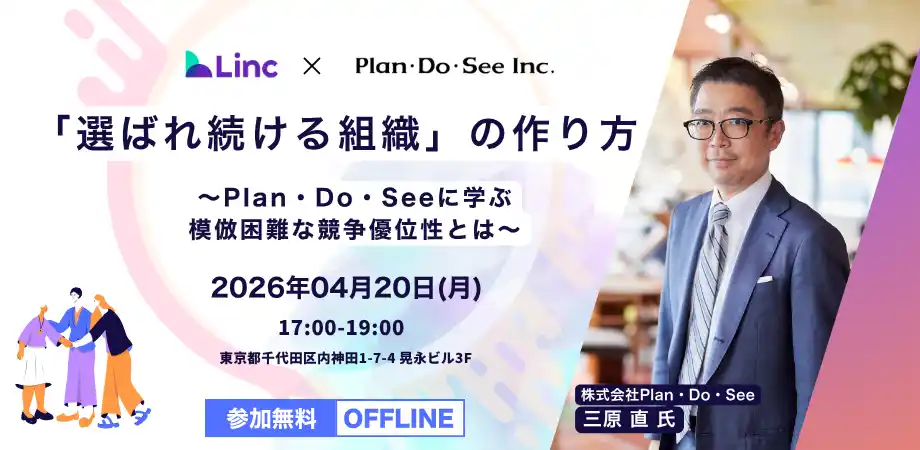 「日本に来てよかった」を最大化することをミッションに、外国人材の採用・定着支援AIプラットフォーム「Global Hub(グロハブ)」を展開する株式会社Linc(本社:東京都千代田区、代表取締役:仲 思遥、以下「当社」)は、2026年4月20日(月)、数多くの人気ホテル・レストランを運営する株式会社Plan・Do・Seeの新卒第1期生であり、同社を「Great Place to Work(R) 日本TOP3」へと導いた三原直氏を招聘し、サービス業における本質的な組織変革をテーマとしたセミナーを開催いたします。 |