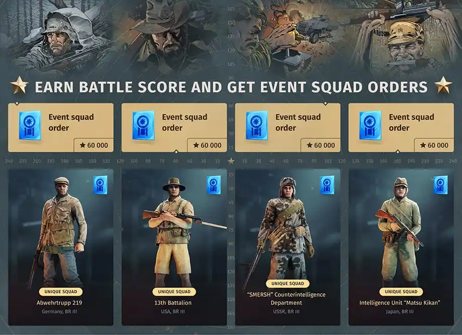 期間中、ゲーム内戦闘でバトルスコア60,000を獲得するごとに命令書1枚が受け取れ、「潜入工作兵(Saboteur)」1名と引き換えることが出来ます。特別イベント期間中に最大4枚の命令書が受け取ることが出来ます。どなたでもゲーム内戦闘をプレイするだけで、新たに加わったばかりの兵科「潜入工作兵(Saboteur)」の兵士を手に入れることが出来ますので、ご挑戦ください。 |