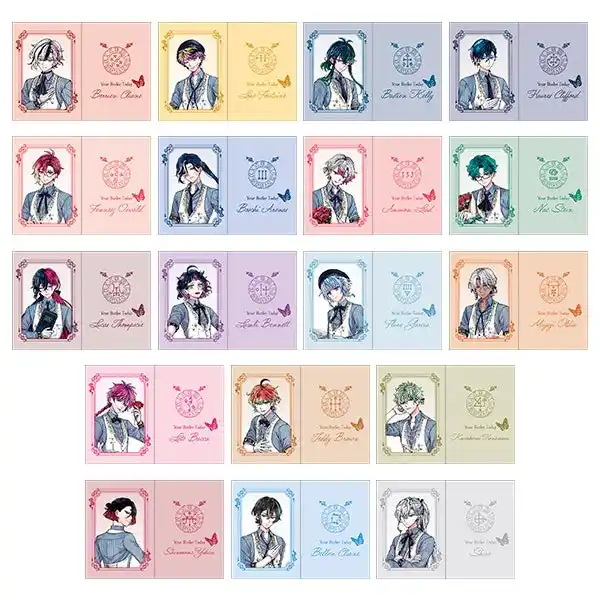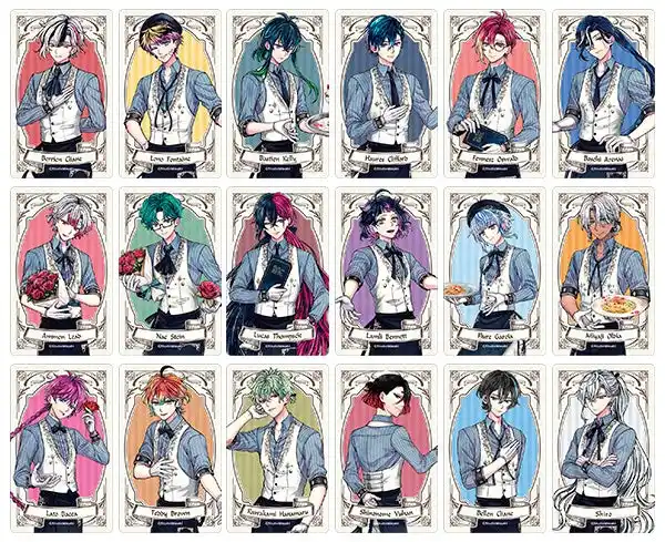 | 新商品には、カフェ店員に扮した執事たち18人の撮り下ろしビジュアルを使用。「トレーディングクリアカード」や「アクリルスタンド」、「ネックストラップ付カードホルダー」など、さまざまなアイテムをラインナップしています。 | |||||||||||