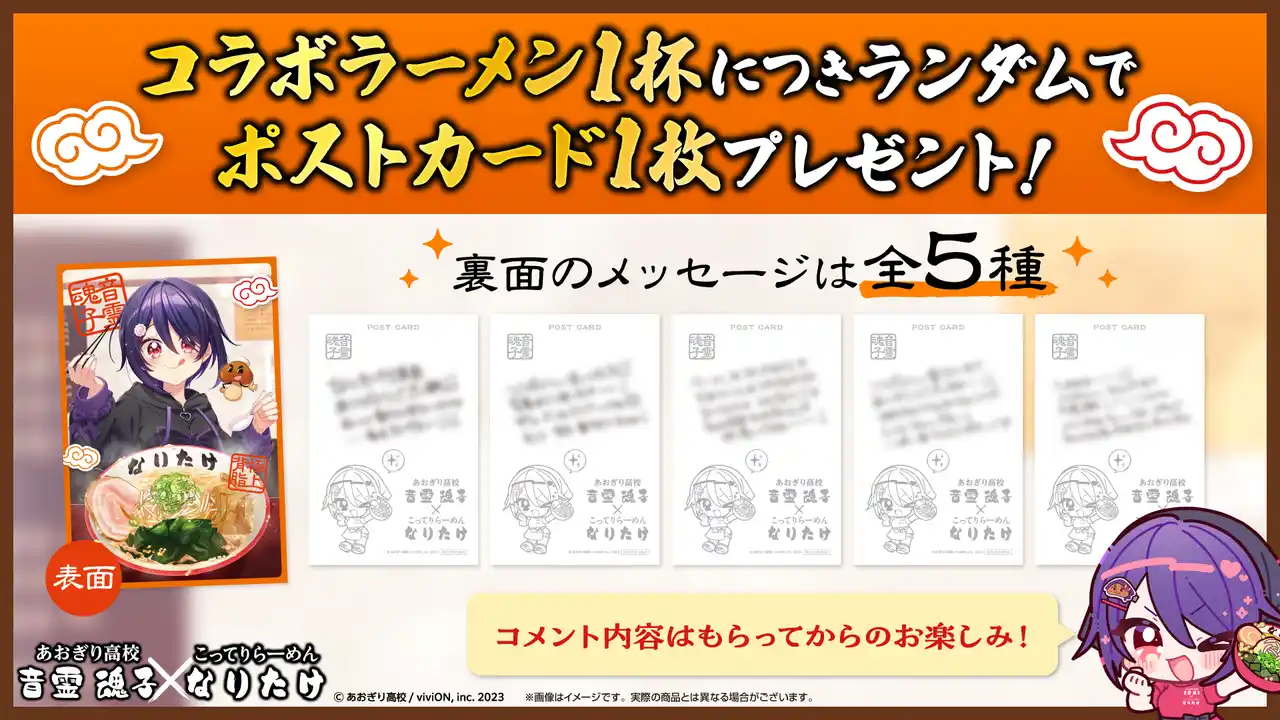 ノベルティ: コラボラーメン1杯につき、 「ポストカード(全5種)」を数量限定でランダムプレゼント! 裏面には魂子からの限定メッセージが綴られています。 |