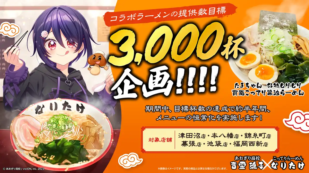 株式会社viviON(所在地: 東京都千代田区、 代表取締役: 明石耕作)は、 運営するVTuberグループ「あおぎり高校」所属の音霊魂子(おとだま たまこ)と、 背脂ラーメンの銘店『こってりらーめん なりたけ』(運営: 有限会社なりたけ)による初のコラボレーションフェアを、 2026年4月16日(木)より全国6店舗にて開催いたします。