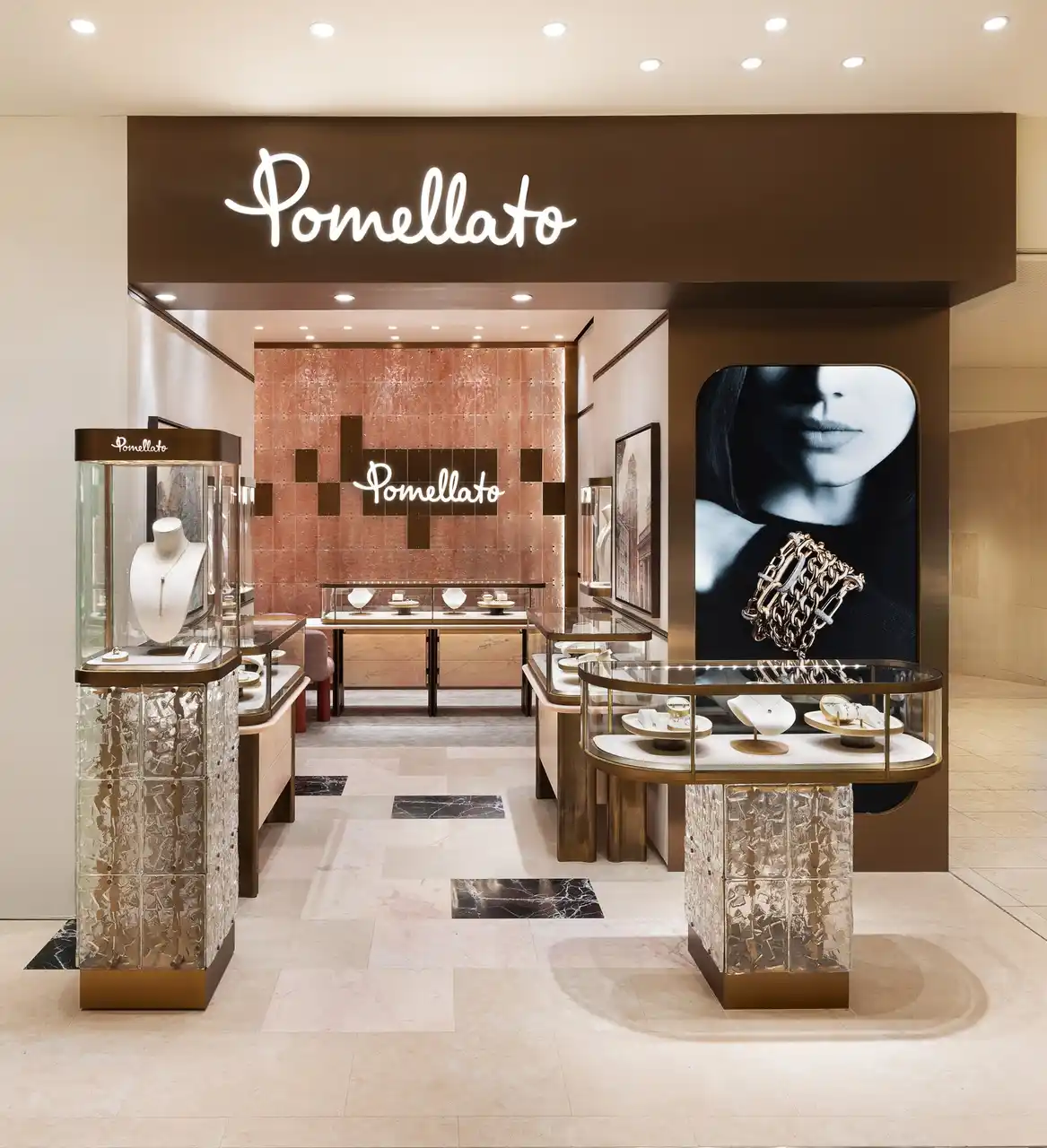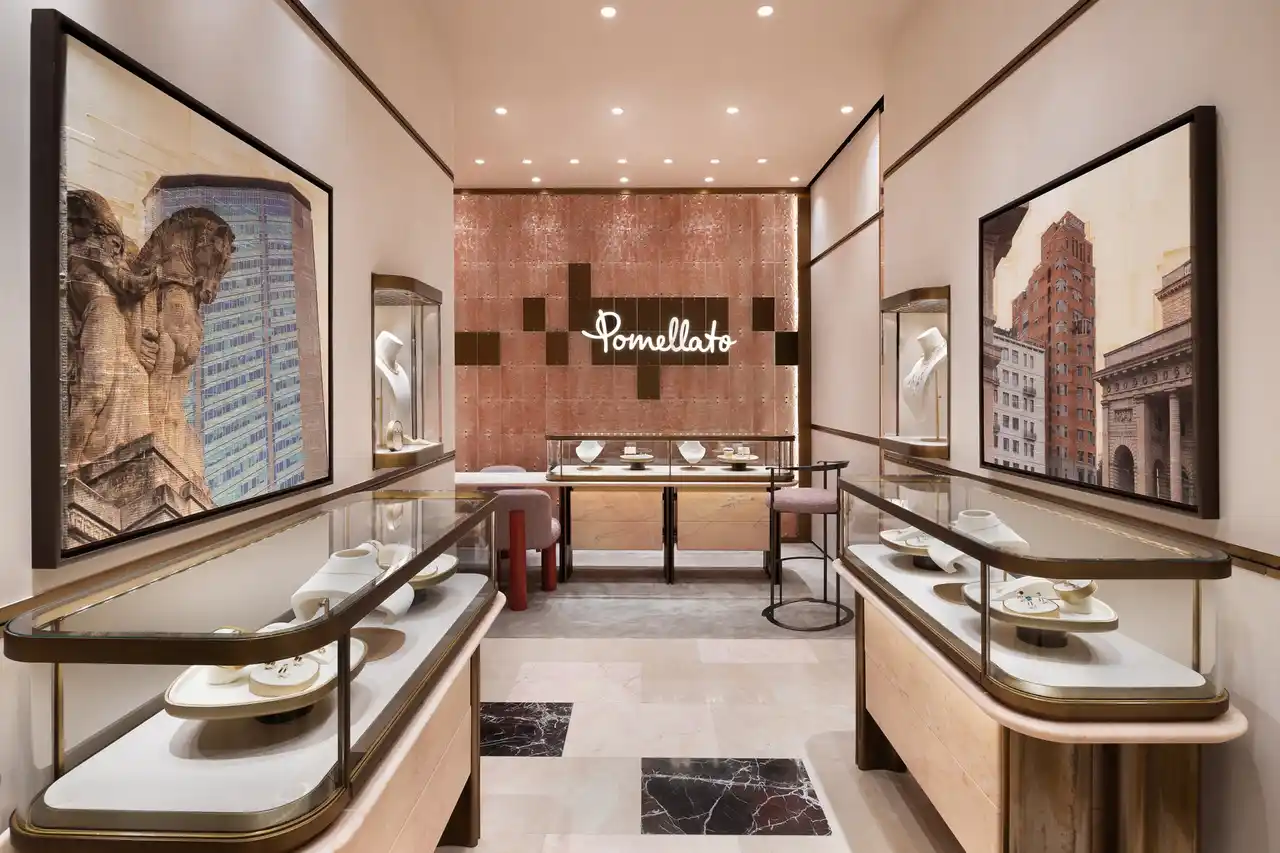 | 象徴的な要素となるのは、ミラノの照明デザイナー「6:AM」とのコラボレーションにより生まれたウォールです。質感の異なるガラスパネルと、彫刻のような真鍮パーツをリズミカルに組み合わせることで、光をやわらかく取り込み、空間に奥行きをもたらします。中央に配されたポメラートのロゴは、あたたかな光を受けて際立ち、ジュエリーの輝きを美しく引き立てます。 | |||