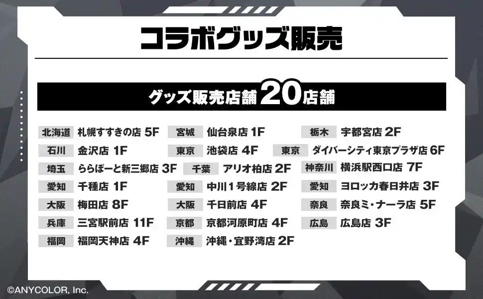 ※下記20店舗以外の店舗ではグッズの販売は行っておりませんのでご注意ください。 |