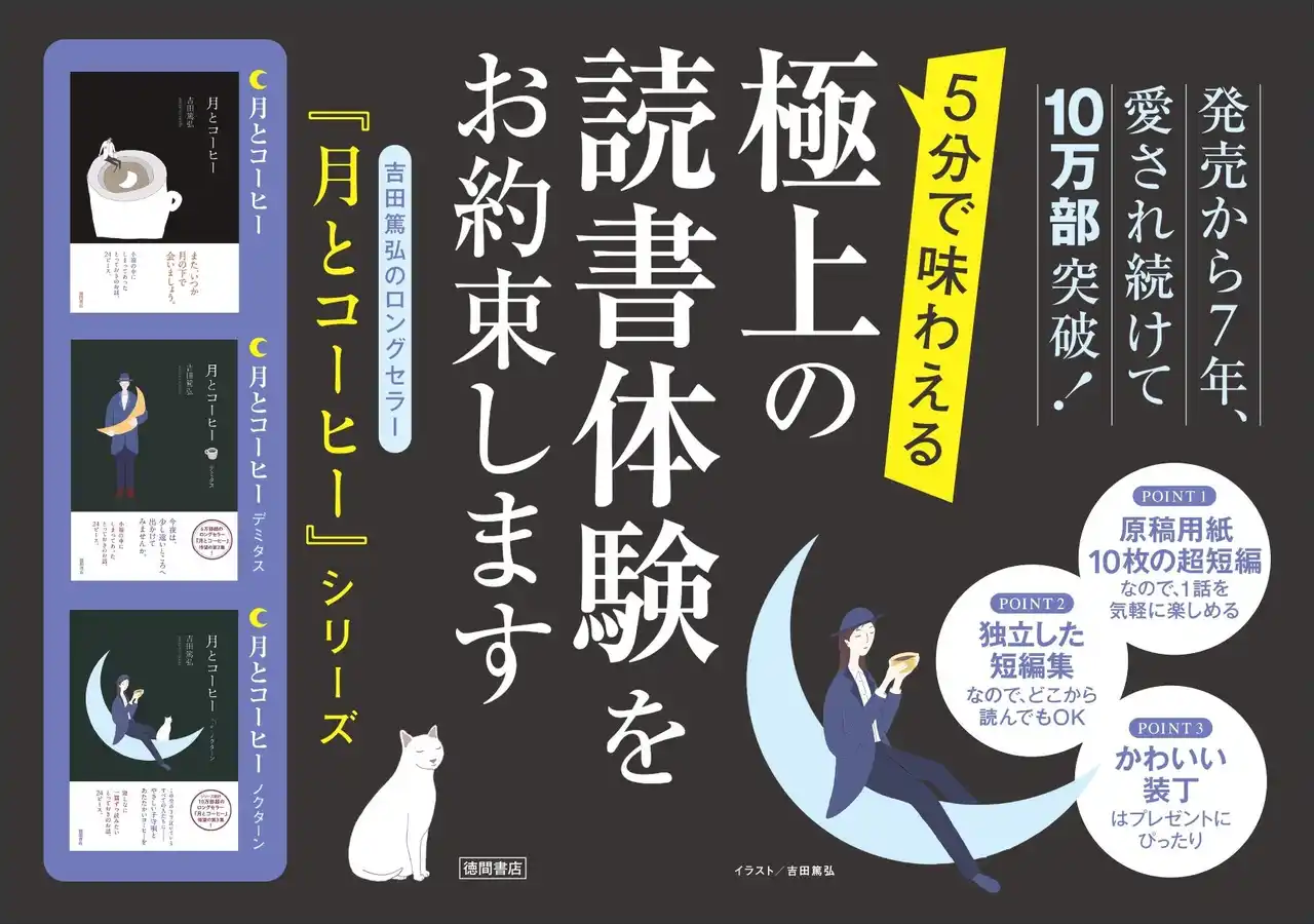 1話の長さは原稿用紙10枚程度。 独立短篇集なのでどこから読んでも大丈夫。 手軽に物語を楽しめるスタイルが好評を博し、 2019年の刊行以来、大ロングセラーとなっている 『月とコーヒー』。 |