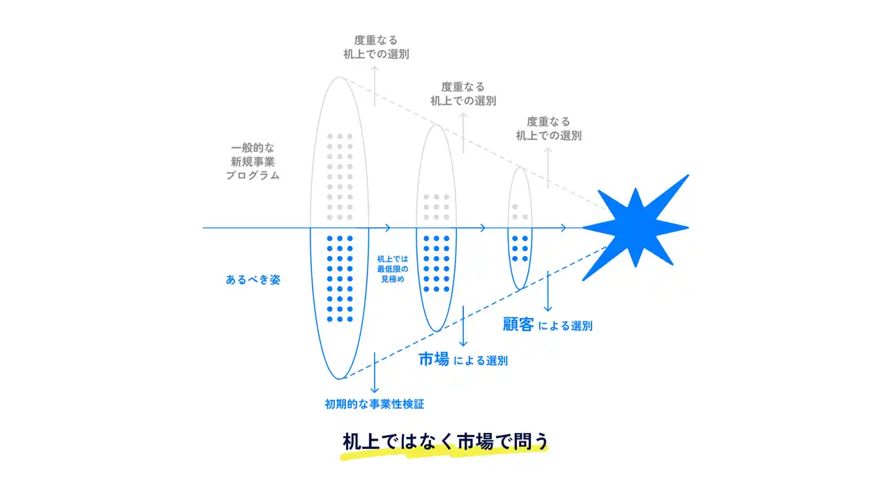 時間をかけて社内で審査・選抜する従来型のプログラムとは異なり、「Spark」では独自の「ステージリーグ制」を導入しています。初期段階における社内での見極めは最小限にとどめ、段階ごとに目的と推進体制を変えながら、できるだけ早く実際の顧客に触れさせることで、実地での試行錯誤を通じて事業を磨き込み、次に進むテーマを見定めていきます。また、審査・検証プロセスでは、経営層や各領域の専門家が直接伴走し、市場性や実現可能性をともに高める体制を構築しています。 |