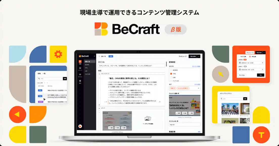 BeCraftは、シンプルかつ高度にコンテンツ管理を行うパッケージ型ヘッドレスCMSです。エンジニアに依頼することなく、現場担当が自身で管理画面にコンテンツを入力することで、APIを通じてWebサイトやアプリといった様々なチャネルに配信できます。 |