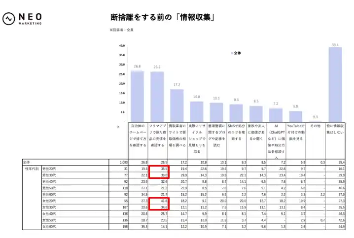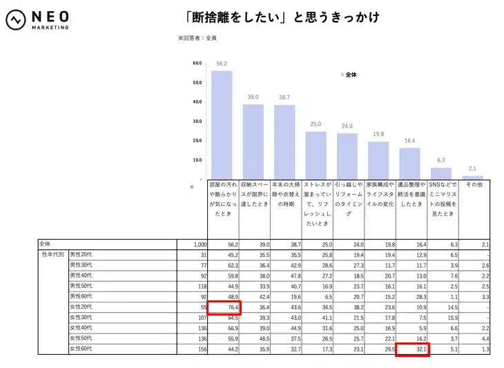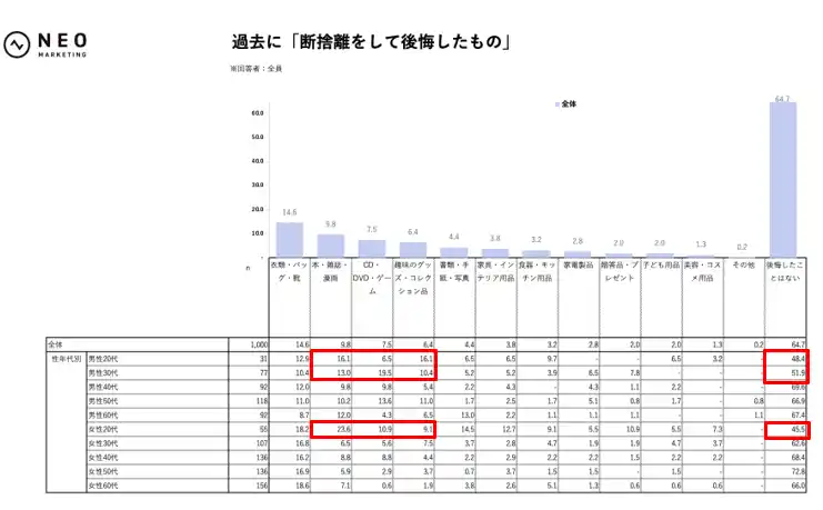 マーケティング支援事業を提供する株式会社ネオマーケティング(所在地:東京都渋谷区)は2026年3月3日(火)~2026年3月4日(水)の2日間、全国の20歳以上の男女で断捨離をしたことがある人を対象に「断捨離」をテーマにインターネットリサーチを実施いたしました。 |