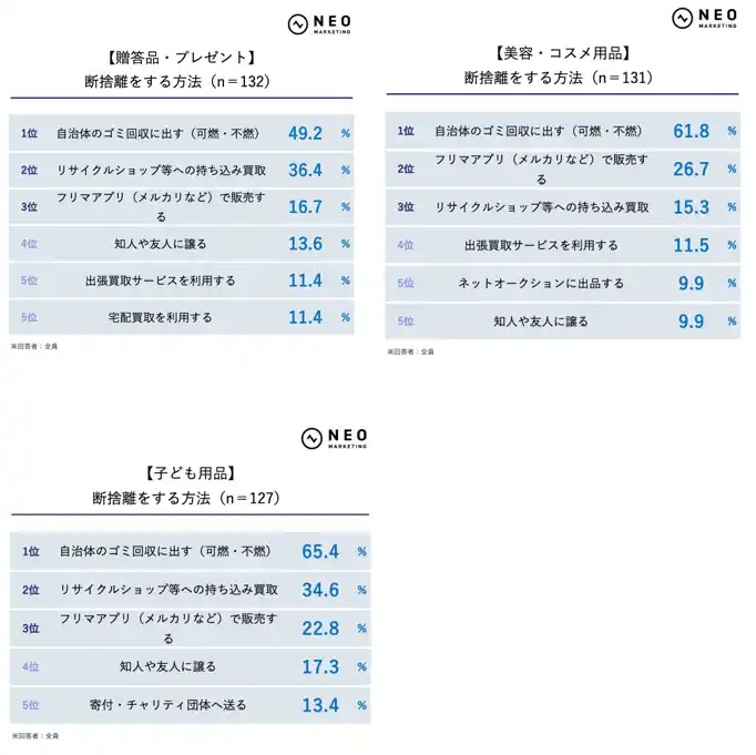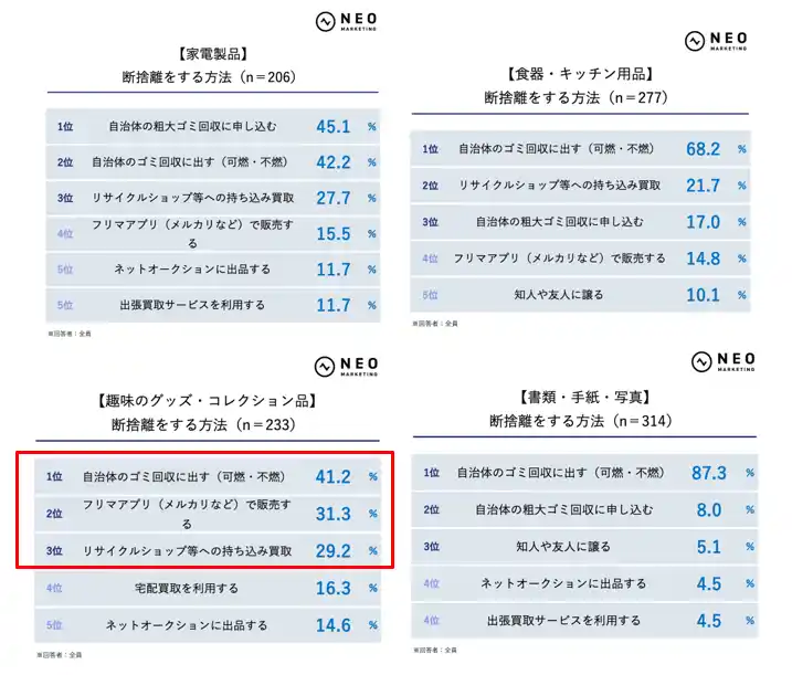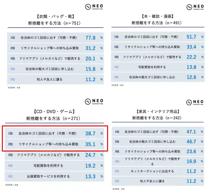 断捨離の方法は、どのジャンルでもまず「自治体のゴミ回収に出す」がトップでした。 |