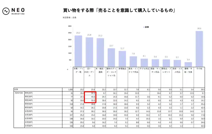 性年代別では、男性30代の「CD・DVD・ゲーム」40.3%、男性40代32.6%、男性20代32.3%が目立ち、若年~中堅男性では娯楽系を“いずれ売るもの”として捉える感覚が比較的強いようです。 |