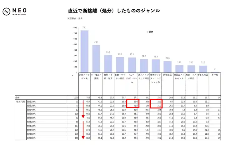 一方で若年男性は処分ジャンルがやや異なり、男性30代では「CD・DVD・ゲーム」46.8%、男性20代では「趣味のグッズ・コレクション品」32.3%が目立ちます。 |