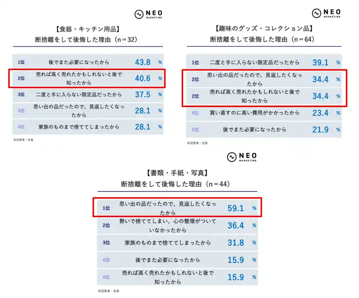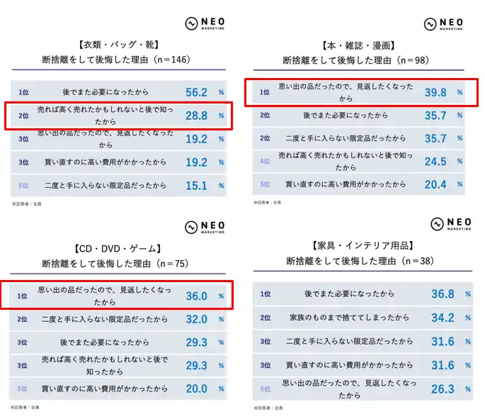 一方、本・雑誌・漫画やCD・DVD・ゲーム、趣味のグッズ・コレクション品、書類・手紙・写真では、「思い出の品だったので、見返したくなったから」が上位に。情報や記録、思い出が残るものほど後悔につながりやすい傾向です。 |